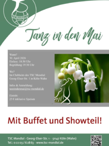 Hier sind sie, die Startzeiten für den Osterpokal im TSC Mondial. Samstag, 28.03.2026 10:00 Uhr Junioren II D-Latein Solo 10:15 Uhr Kinder D-Latein Solo 11:35 Uhr Junioren I D-Latein Solo 11:45 Uhr Jugend D-Latein [...]